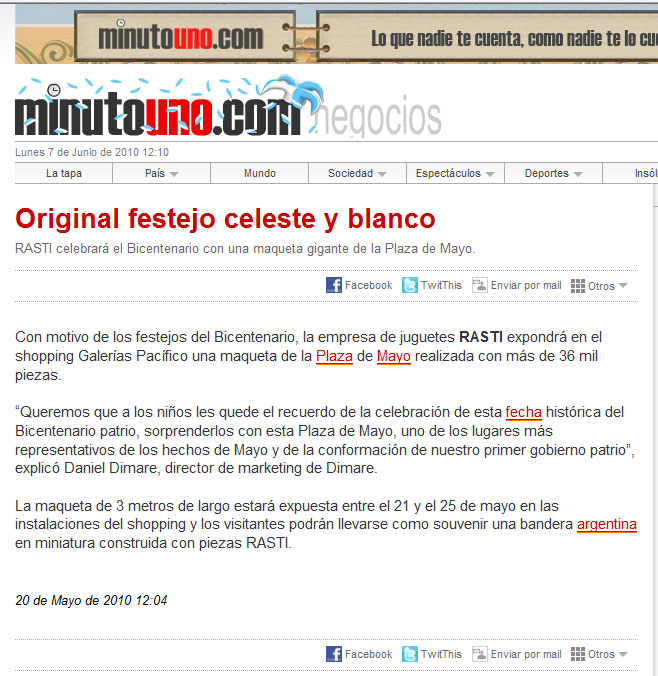Con motivo de la celebración del Bicentenario, a partir del 21 de mayo, Juguetes RASTI y Galerías Pacífico exhibirán una mega maqueta de la Plaza de Mayo actual, construida íntegramente con más de 36.000 piezas RASTI.